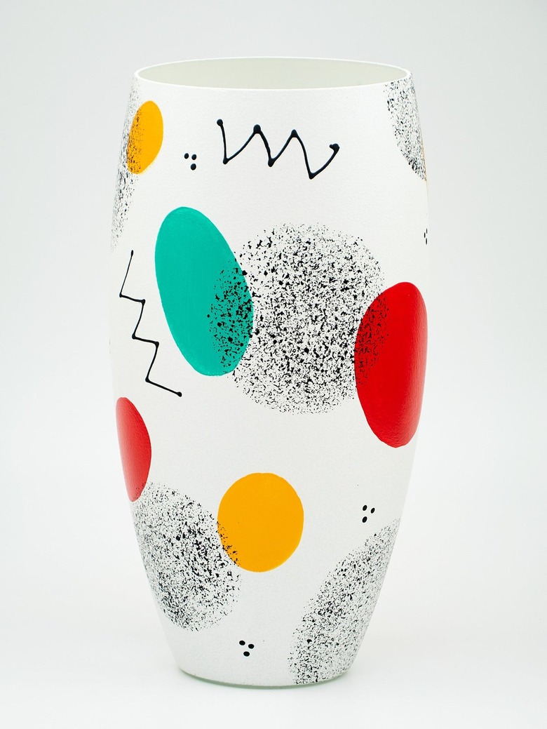 For a Memphis-ish decor item with an artisanal twist, consider a colorful handmade vase. This vibrant vessel is hand-painted with brightly hued squiggles and dots.
