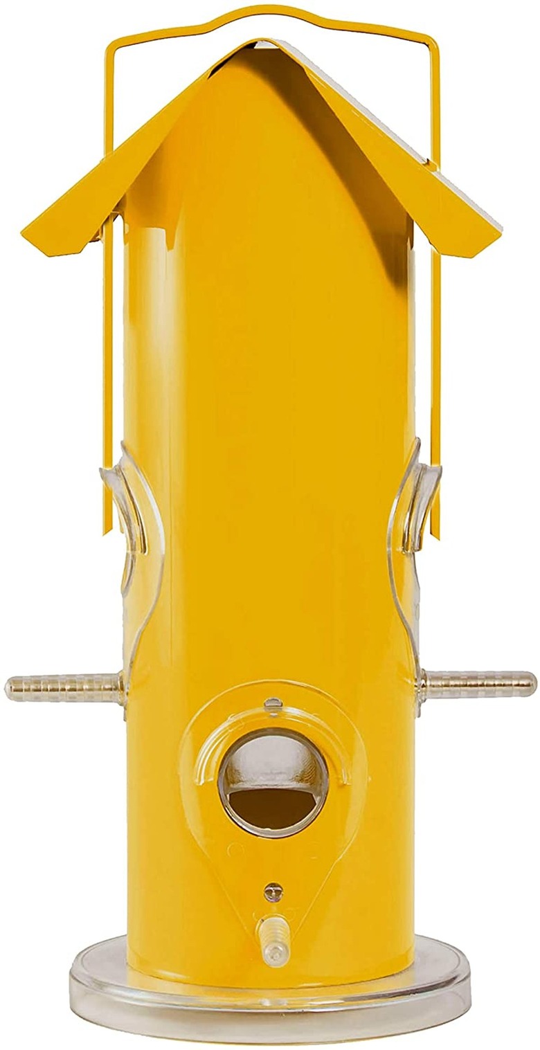 A sunny yellow bird feeder can bring a pop of color to your backyard while providing feathered visitors a fun place to eat and perch. This bright powder-coated tube feeder can hold up to 12 ounces of seed and features four removable perches for multiple birds.