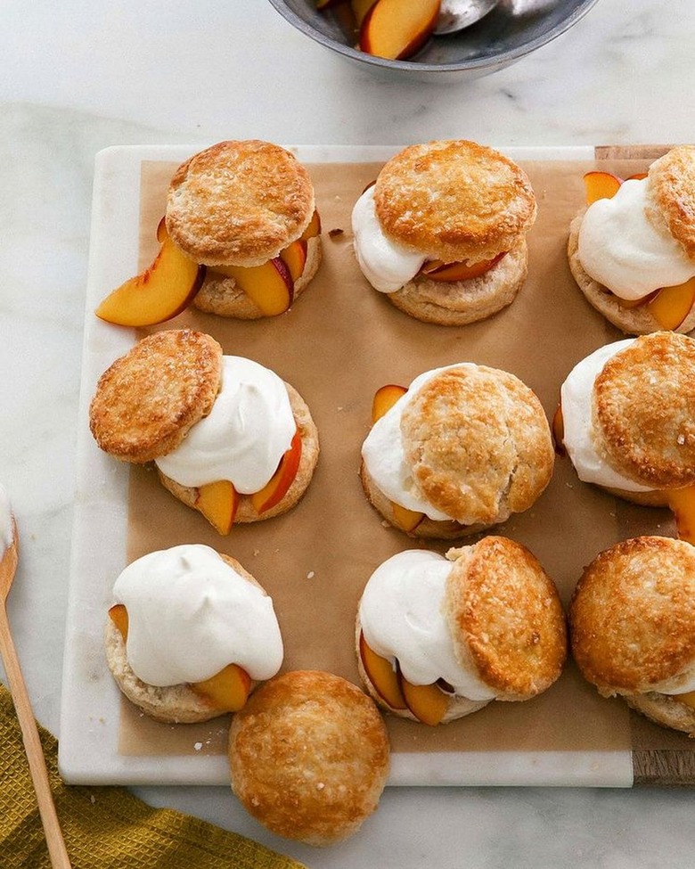 In between these fluffy biscuits, you'll find macerated peaches and soft whipped cream. We're so happy, we're crying.