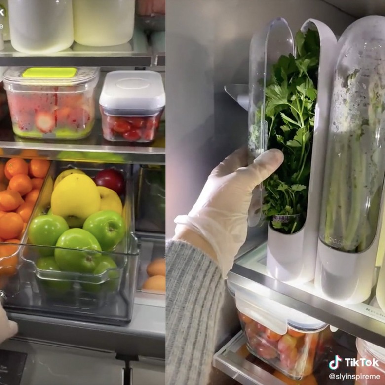 This mesmerizing video is more focused on showing you an already organized fridge, but TikTok user @slyinspireme goes through the containers to show us what goodies are inside. We'd never seen those herb holders before!