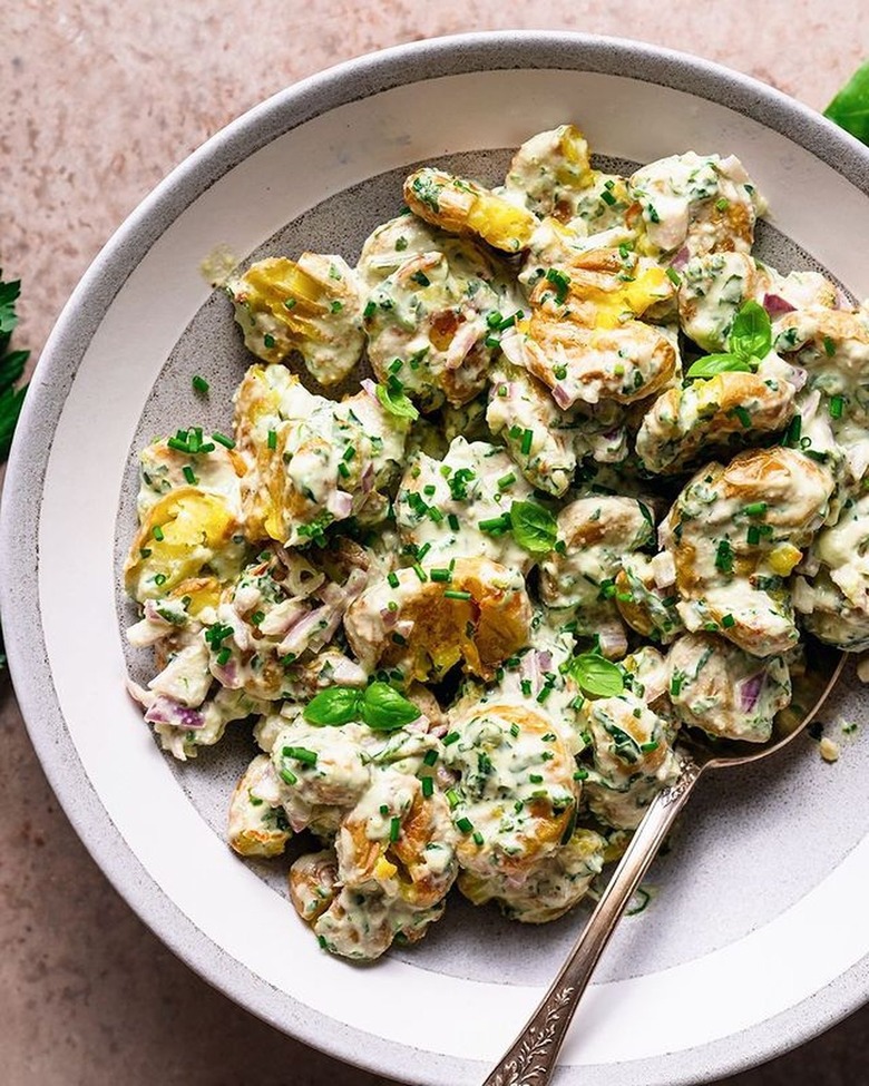 2. The Curious Chickpea Smashed Potato Herbed Salad