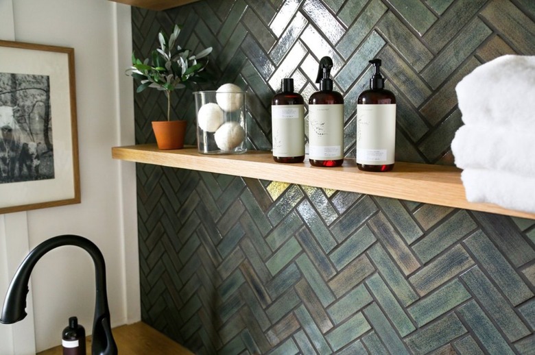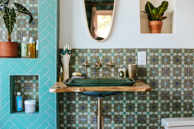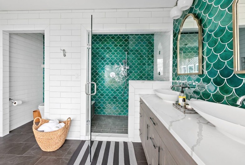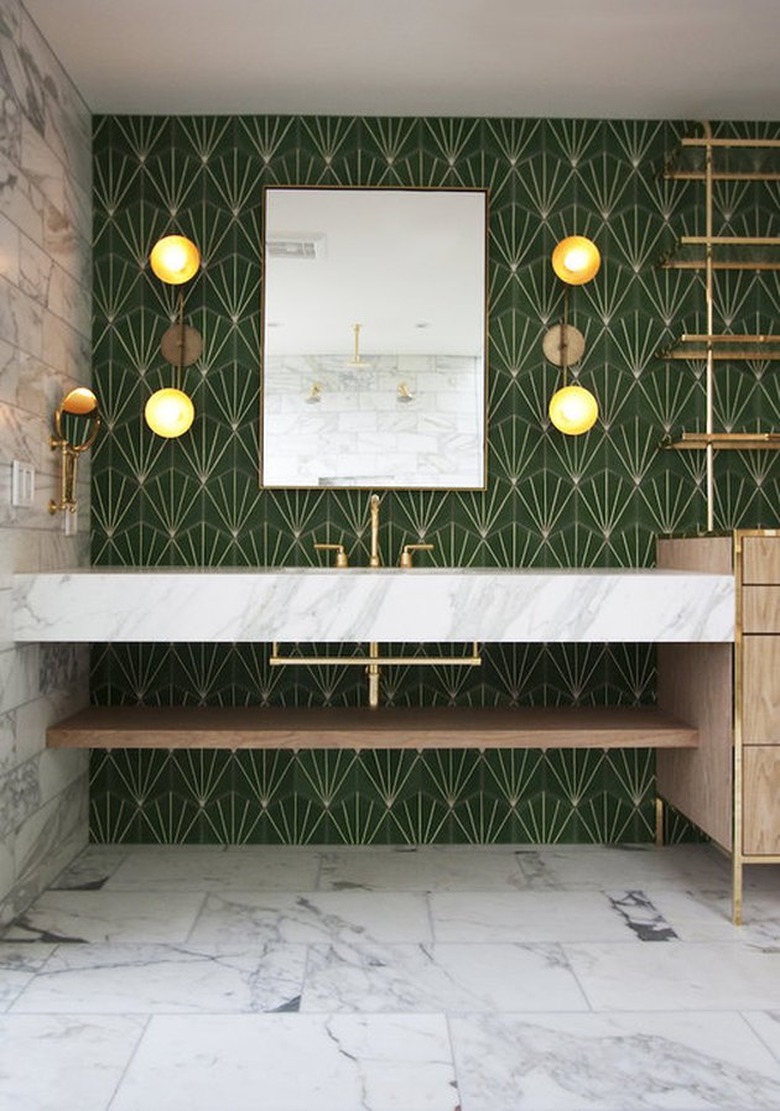 If you love green (and really who doesn't?), go big with a tile backsplash that truly makes a splash. This unique patterned look from Bright Design Lab is inspired not overwhelming. Think about adding something like this in your own bathroom even if you're a renter. There are lots of styles and shapes to make your space feel intentional.