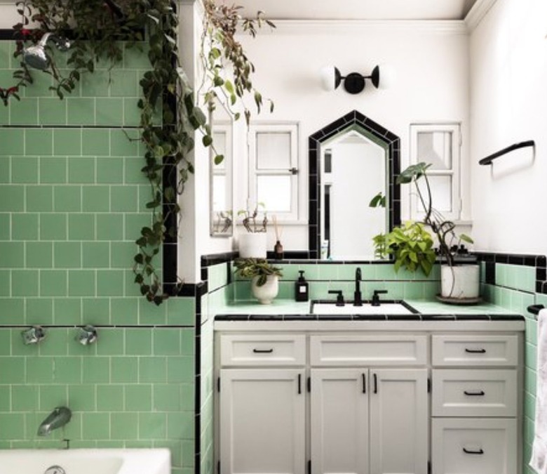 This old-school look with light green ceramic tiles stands the test of time. Have a bathroom that feels tired or dated? Skip all the pricey home improvement, and lean into what's unique about the space. Embrace that classic look, and simply add modern touches like a black faucet and plants. We love how truly charming this bathroom is and always will be.