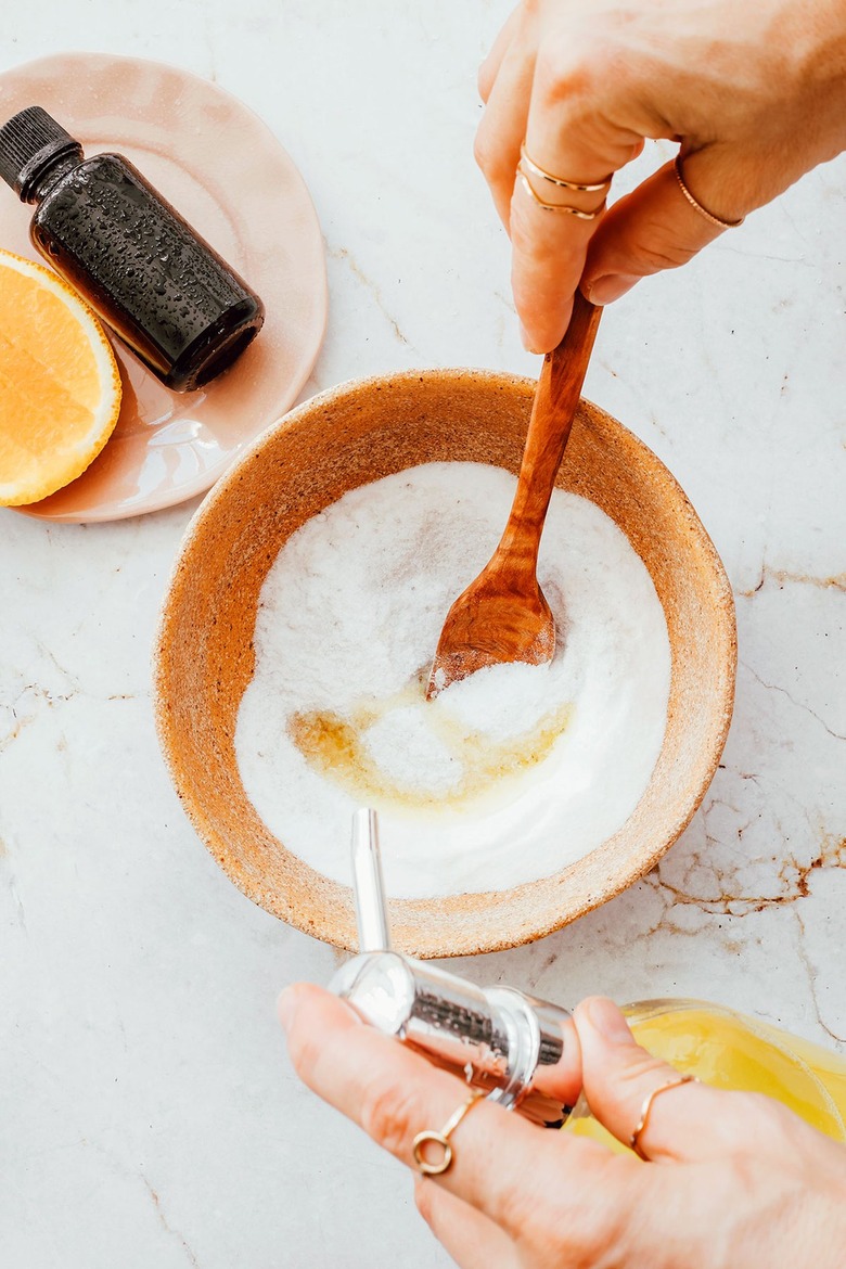 Add the essential oils, if using, and stir together. You can use an oil because you like the smell or pick one that will up the scrub's bacteria-fighting power. I like the classic, fresh clean scent of citrus when I'm cleaning, and most citrus essential oils, like lemon or lime, are also antibacterial.