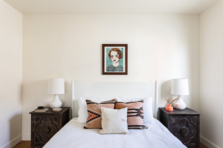 Similarly, symmetrical bedroom furniture setups are no longer the standard option. "Occasionally, the symmetrical look can create balance and uniformity, [but] it has lost its importance [as] the only way to design," Karen Gutierrez, interior designer at Mackenzie Collier Interiors, tells Hunker. You can also diverge from the symmetrical look — and create a more dynamic space — by changing the composition of your lamps or art above the bed, she adds.