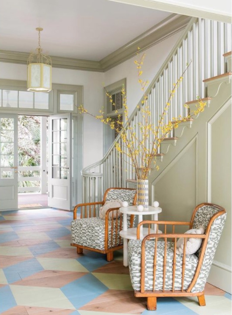 2. This traditional space gets turned on its head perfectly with some quirky decor in a pic from Katie Charlotte's grid. Pale green trim and molding with a painted wood floor form a backdrop for the perfect hang out spot for coffee, tea, or maybe something with a little more kick.