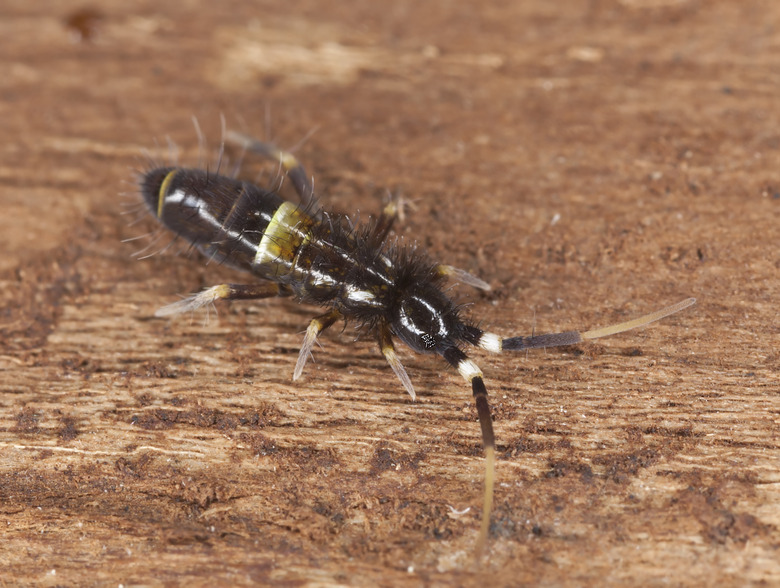 Long and skinny, springtails are fuzzy-looking black bugs with segmented bodies growing up to 1/4 inch in length. They can't fly, but they can jump, so you may wish to distance yourself from them a bit. Since they prefer to eat decaying organic material, springtails generally don't leave behind a lot of plant damage. They have been known to nosh on plant roots from time to time, however, and most plant keepers don't like seeing them squirming through the soil.