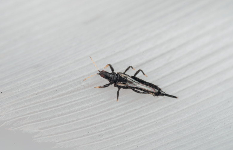Yellow or black in color, thrips measure less than 1/16 of an inch and are difficult to spot. You're more likely to see the damage thrips leave behind than the insects themselves. This damage includes a silver appearance to leaves, leaf drop, and oddly colored streaks in flower petals. Thrips can also cause flower buds to die without ever opening.