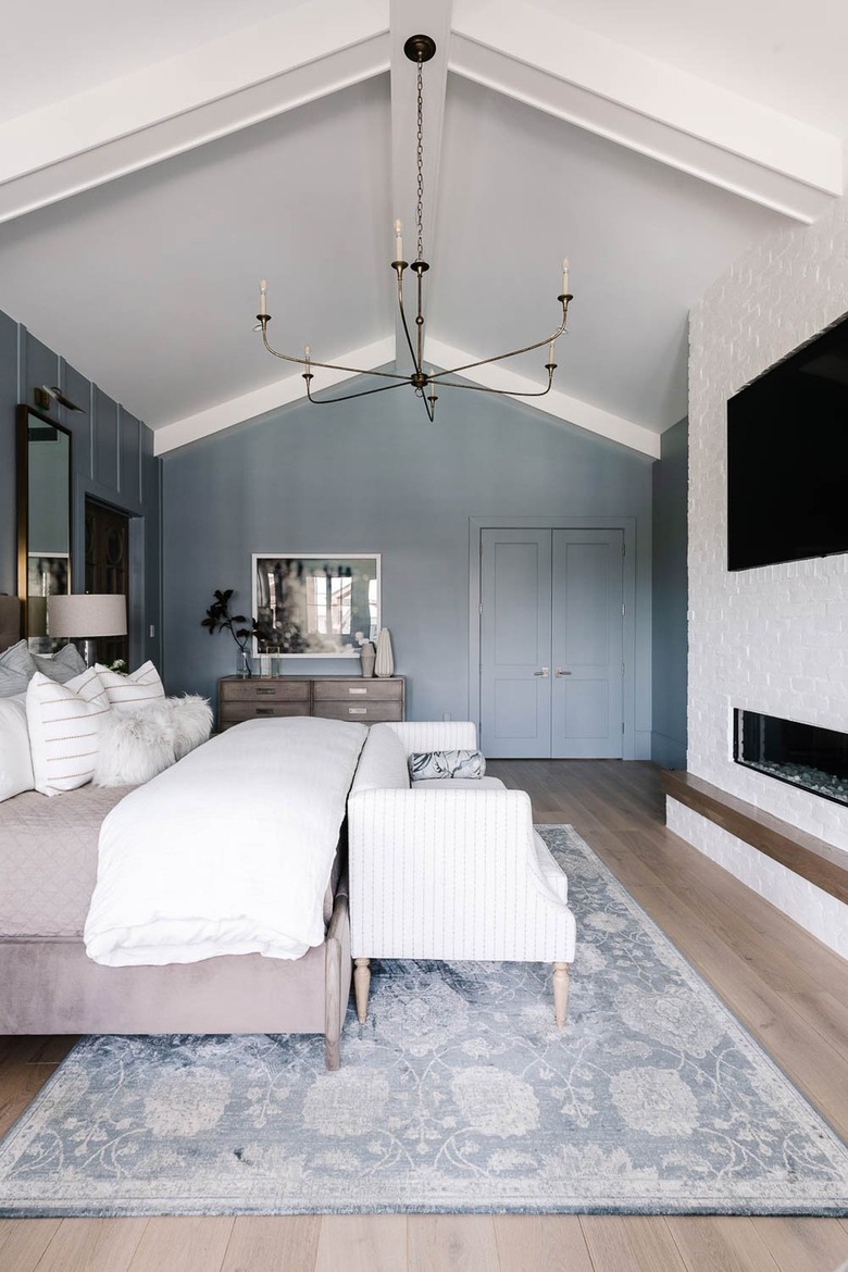 Just because you want to go with a cool color, that doesn't mean you can't enjoy a bit of drama, too. Follow the lead of designer Megan Ellaby and go for a dark shade of navy blue to turn your spacious bedroom into a cozy den of slumber. Pops of white and eclectic artwork keep the room from feeling like a cave.