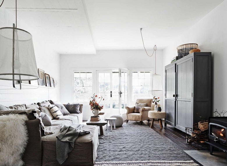 If you're looking to dip your toes into vintage design, start small in your living space with a statement piece or two, like Lynda Gardener did in this Scandi-meets-farmhouse cottage. The old-fashioned wood-burning stove and the picture ledge above the sectional sofa, displaying an assortment of black-and-white photos and oil paintings, elude to a storied past. The linen lanterns, an abundance of accent pillows, and sheepskin throws are essential to nailing the art of hygge.