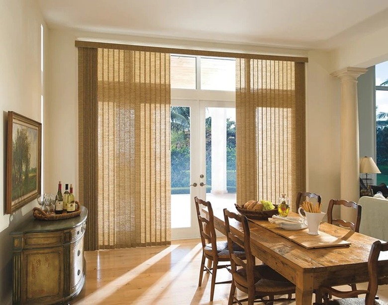 This sliding action gets the blinds completely out of the window or door so you can walk out onto your patio or simply enjoy an uninterrupted view. If you wish, you can customize your vertical blinds and have them made of fabric or have the slats built in a curved shape that looks softer. Fabric blinds tend to pick up dirt from the floor more quickly, however, and may prove difficult to keep clean. Vertical blinds made of firmer materials tend to clack together when disturbed, which some people find annoying.