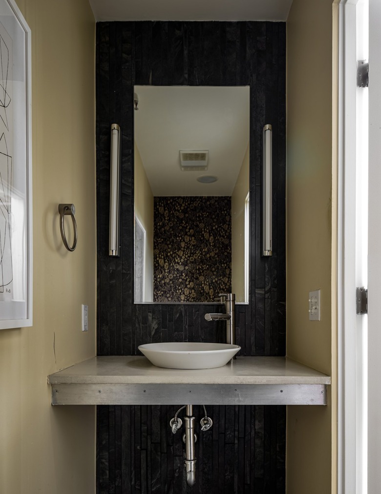 Once those pieces were set, we added the Alno Inc Towel Ring ($80), which tied in with the burnished sheen of the sconces and sink hardware.