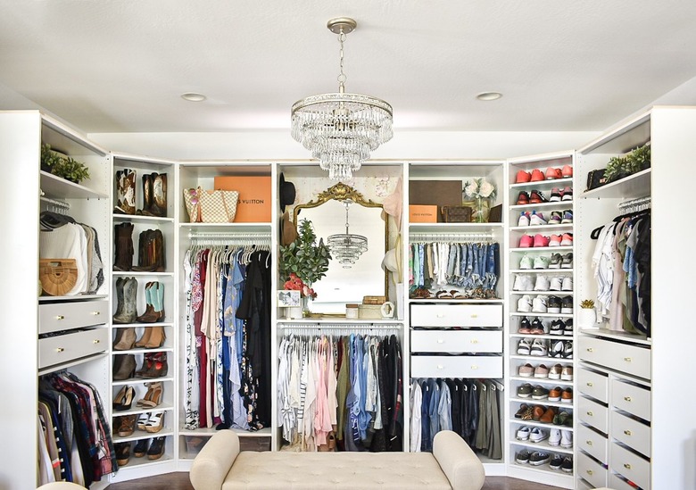 Trying on clothes is hard work, right? Add seating to your walk-in closet so you can take a load off in between outfit changes. Plus, it will also add a luxurious note, as proven by this setup from Lifestyle by Anna Elizabeth. Here, a large ottoman looks right at home positioned below a delicate chandelier.
