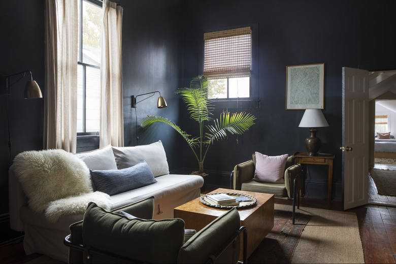 Also, consider your lighting situation. Does your setup get tons of natural light or hardly any? Do you have ample overhead lighting or will you need to invest in a few fixtures? Additional factors to take into account are the existing finishes (such as the flooring) and furniture pieces. How will these elements play into your new color palette? Now, in the words of The Rolling Stones, it's time to "Paint it Black." Go grab your painting overalls and get started on the dark living room of dreams.