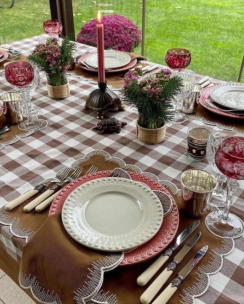 You might not immediately think of magenta as a fall color, but once you see it paired with brown, green, and pink, it all makes sense. This table design from @homesandseasons is a perfect example and reminds us of a cozy gingerbread house. (Plus, the turtle decor is adorable!)