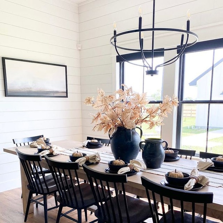 Courtesy of @thecozyfarmhouse on Instagram, we're now dreaming of gothic fall tablescapes. We especially love how they paired black vases and tableware with more rustic wood and neutral elements.