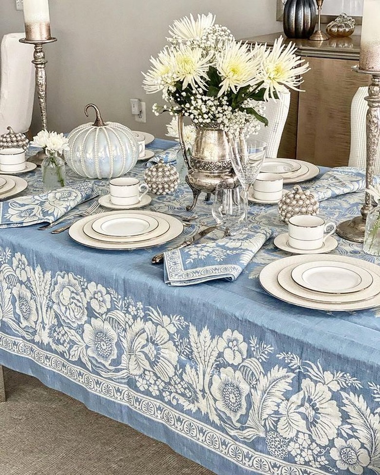 The color of autumn leaves might automatically make you think of gold, but don't be afraid to adopt a silver decor scheme. On their tablescape, @table_with_taste does a wonderful job of pairing silver with blue, white, and a bit of yellow to create a space that feels both antique and regal at the same time.