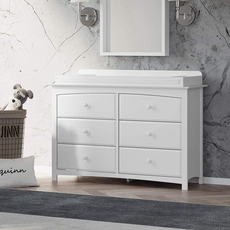 Dressers can work wonders to wrangle your little one's tiny clothes, toys, and accessories, so they're a great addition to any nursery. This one comes in five neutral colors, ranging from white to black, so you'll have no trouble finding the right hue for your aesthetic. It's made of solid cherry wood with steel hardware, so your little one can make use of it for many years to come.