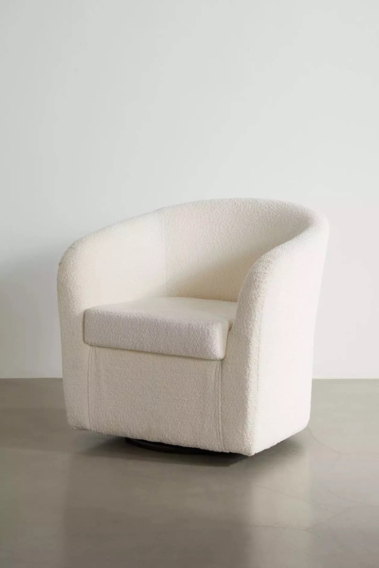 Swivel your little heart out in this top-rated number. The cream-colored faux shearling is an equally trendy fabric that has a very similar aesthetic to bouclé.