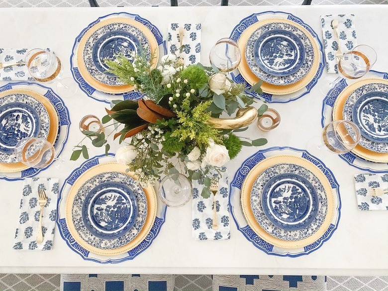 Blue and white porcelain might be a go-to for spring and summer tablescapes, but we think it works perfectly for the holidays, too — especially when paired with a winter floral arrangement and gold details, just as @gretchenblack has done.