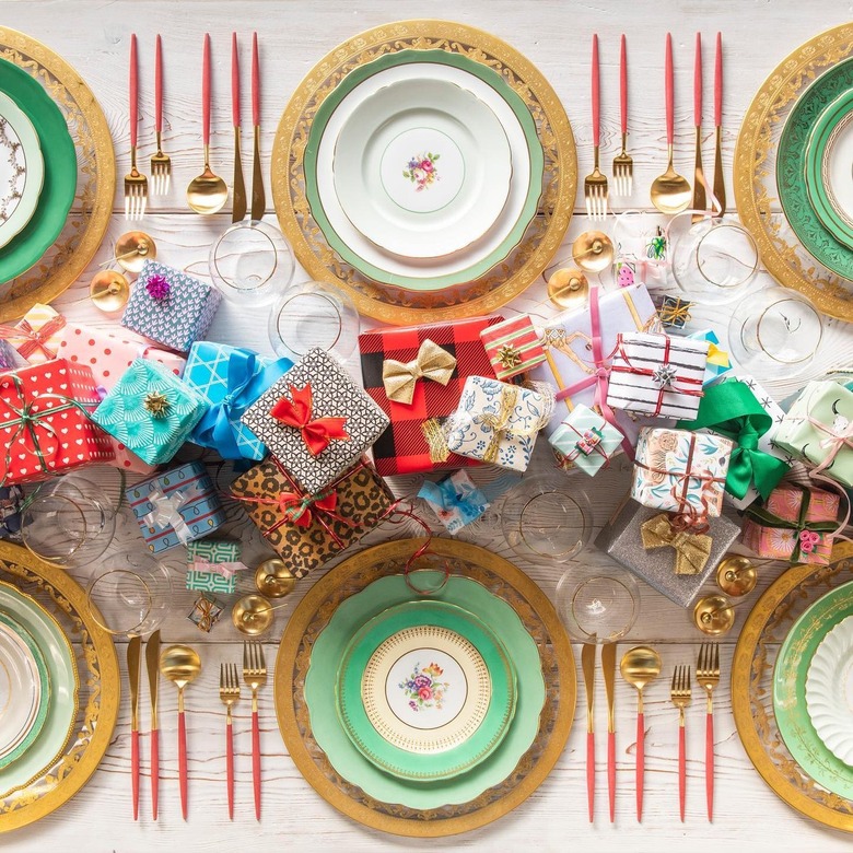If a traditional color palette is a little too staid for you, consider creating a centerpiece from colorfully wrapped presents — @casadeperrin shows us how it's done! To borrow the look, simply purchase a set of gift wrap featuring different colors.