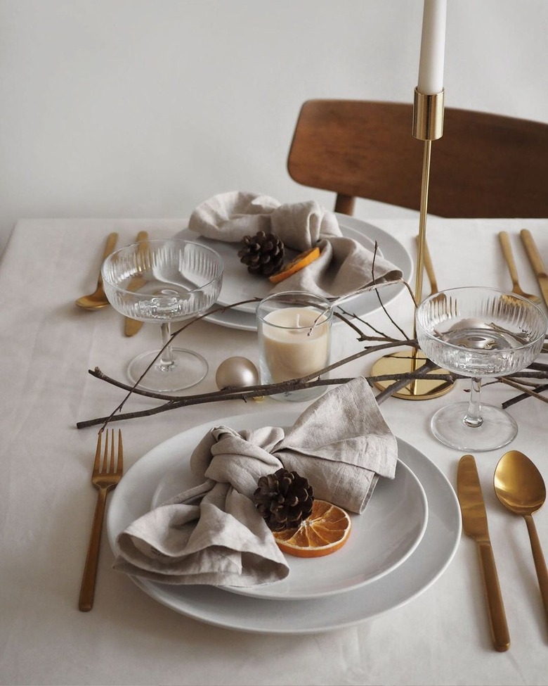 On the opposite side of the spectrum is @melissaselmin's minimalist tablescape, which features a neutral color palette and simple decorations, like twigs and tall brass candle holders.