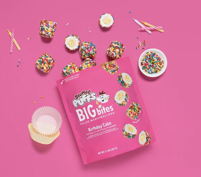 If you haven't heard of Stuffed Puffs, then you're missing out big time. This company paired chocolate and marshmallows together to create the ultimate stuffed treat. Now, they've added even more flavors to their roster with Big Bites. Specifically, the brand's Birthday Cake Big Bites combine fluffy marshmallow, sprinkles, and a cake-flavored filling.