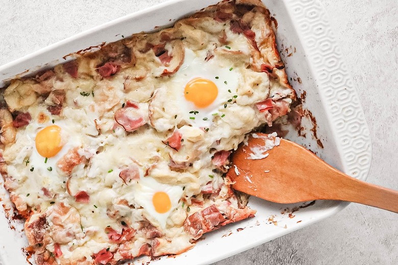 This recipe calls for the same ingredients, but in casserole form. Cubes of white bread are soaked in an eggy mixture, then tossed with chopped ham and shredded cheese. The entire dish is doused in béchamel sauce and topped with even more eggs. It's like multiple croque madame sandwiches have been deconstructed and baked together.