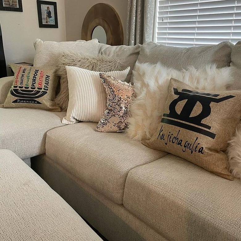 Instagrammer @neneb223's decor incorporates Kwanzaa-themed pillow covers that match the rest of their neutral decor. "Kujichagulia" refers to one of the seven principles, self-determination — to take it a step further, you can switch out your covers for each one of the seven days.
