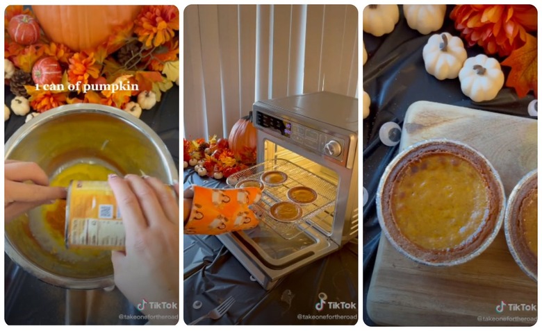 TikTok user @takeonefortheroad shows how to make some mini pumpkin pies in an air fryer. They're the perfect size for smaller fryers! It's super simple — all you have to do is follow the classic pumpkin pie recipe, then toss the pies in the air fryer. For @takeonefortheroad's recipe, the pies just need to go in for eight minutes. Seriously, air fryer pumpkin pie could not be easier.