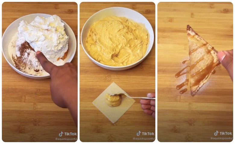 For a slightly different take, you can make these pumpkin pie bites by TikTok user Sophia Wasu (@aquickspoonful). Her recipe calls for pumpkin, instant pudding, Cool Whip, and spices all mixed together, then stuffed into a wonton wrapper. Air fry, add a little pizzazz with cinnamon sugar and caramel, and you've got a crispy fall treat!