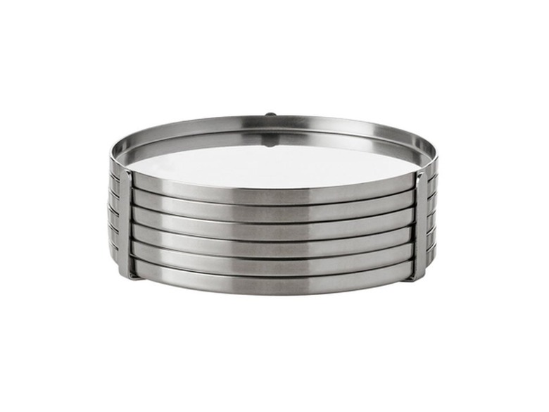 Accessories shouldn't feel bland. Boost party ambience with small details that can make a big impression, like metallic coasters (Arne Jacobsen, $74) that add to the lavish vibe.