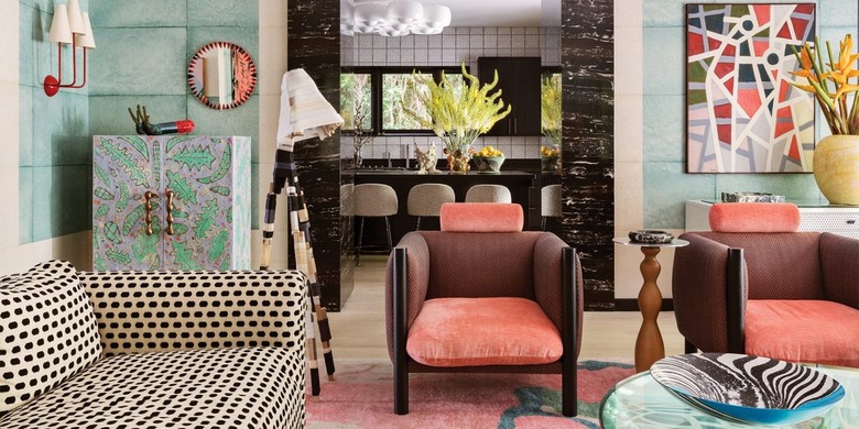 If you're actually a "more is more" person, welcome to your dream living room design courtesy of none other than Kelly Wearstler. During the '80s, interiors showcasing graphic patterns were all the rage. In this maximalist setup, Wearstler has managed to nail the look, weaving patterns and colors together effortlessly. From the mint green block pattern on the walls and the black and white polka-dot sofa to the coral-colored accent chairs and the decorative zebra print bowl on the coffee table, this space has no shortage of visual interest and retro flair.