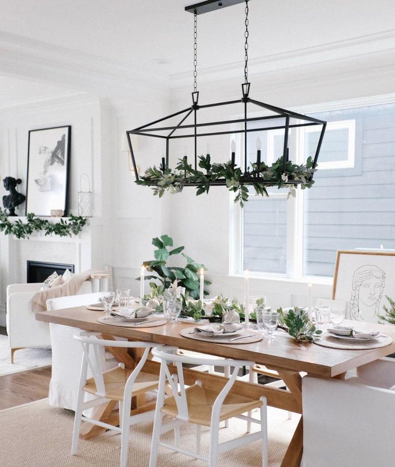 Turn on the charm in your dining area by adding winter touches like greenery and beyond to your chandelier or pendant, to a centerpiece, or even around your windows. All the little touches add up to a big winter feel where you gather for every meal.