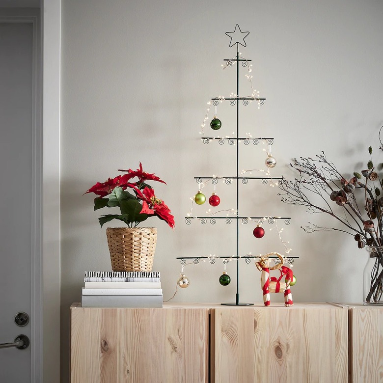 If you don't have the square footage for a full tree, we're loving the look of this steel, green option. To achieve this setup, you just need some of your favorite books, a cheery poinsettia, and a little figurine or two.