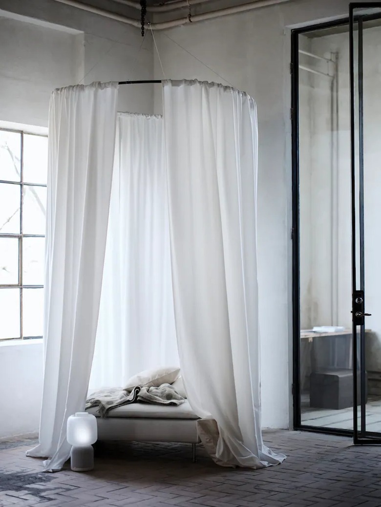 Even if you don't have an entire room available, you can still create some relaxing moments at home. Take, for instance, this use of a sound-absorbing curtain — it's staged to create a little pod to get away from it all. An ottoman gives you a soft place to land, and for bonus points, you can add a WiFi speaker to play white noise or a guided meditation. Let the sunlight in through the window for optimal decompressing.