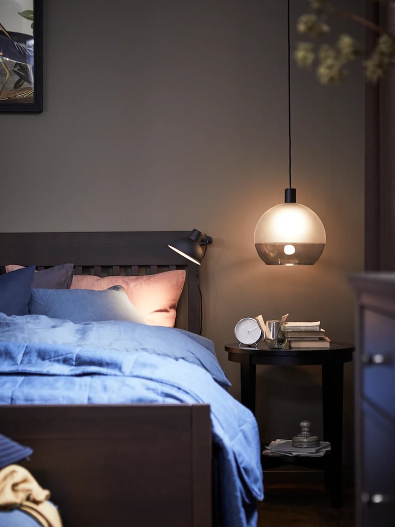 There is something incredibly laid back about this set-up, which IKEA says is a space to "recharge without a screen in sight." After spending the day looking at bright devices, this room would certainly help you unwind. The moody tones of the wall, headboard, and night stand — which is actually a side table — come together effortlessly. And the soft lighting created by the pendant lamp shade completes the look.