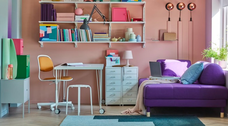 When we asked design experts about what they expect to see in home offices next year, one element was extra seating for decompressing. If your work space has an empty corner, a spot to rest away from your desk is the ultimate comfy element. This work space shows a bright purple sleeper sofa with a blanket and pillows at the ready.