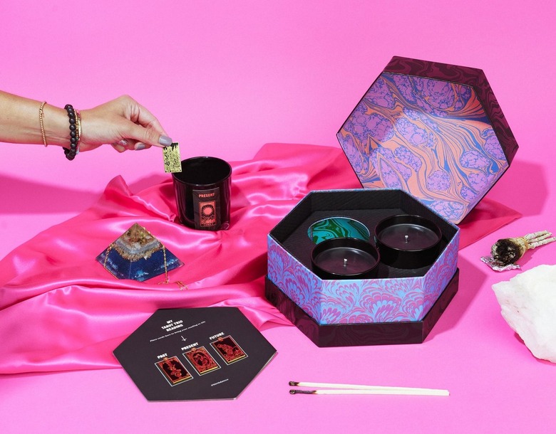 According to Birthdate, the Tarot Trio is the world's first candle set that gives you a luxe candle experience and tarot reading all in one. In the box set, there are three candles that represent your past, present, and future, each with a golden tarot card charm that's revealed when you burn the candle. With a handy guidebook, there are steps to using and interpreting your Tarot Trio set.