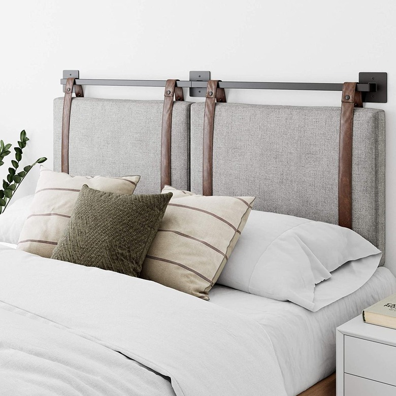 This wall-mounted headboard from Nathan James has faux leather straps and either a fabric or faux leather panels that offer a stylish vintage look for your bedroom. In addition to using it as a bed headboard, it can also be hung behind a bench in an entryway or in your dining room.