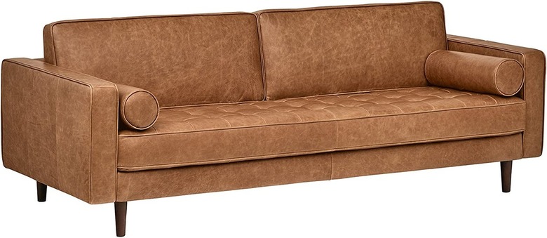 Made from top grain leather, this cognac sofa couch from Rivet with tufted seats, tapered legs, and matching bolster pillows screams midcentury modern.