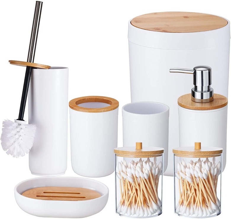 Get practically everything you need in this six-piece bathroom accessory set from iMucci. Available in a range of colors (some with bamboo covers), the set includes a toothbrush holder, toothbrush cup, soap dispenser, soap dish, toilet brush holder, and trash can.
