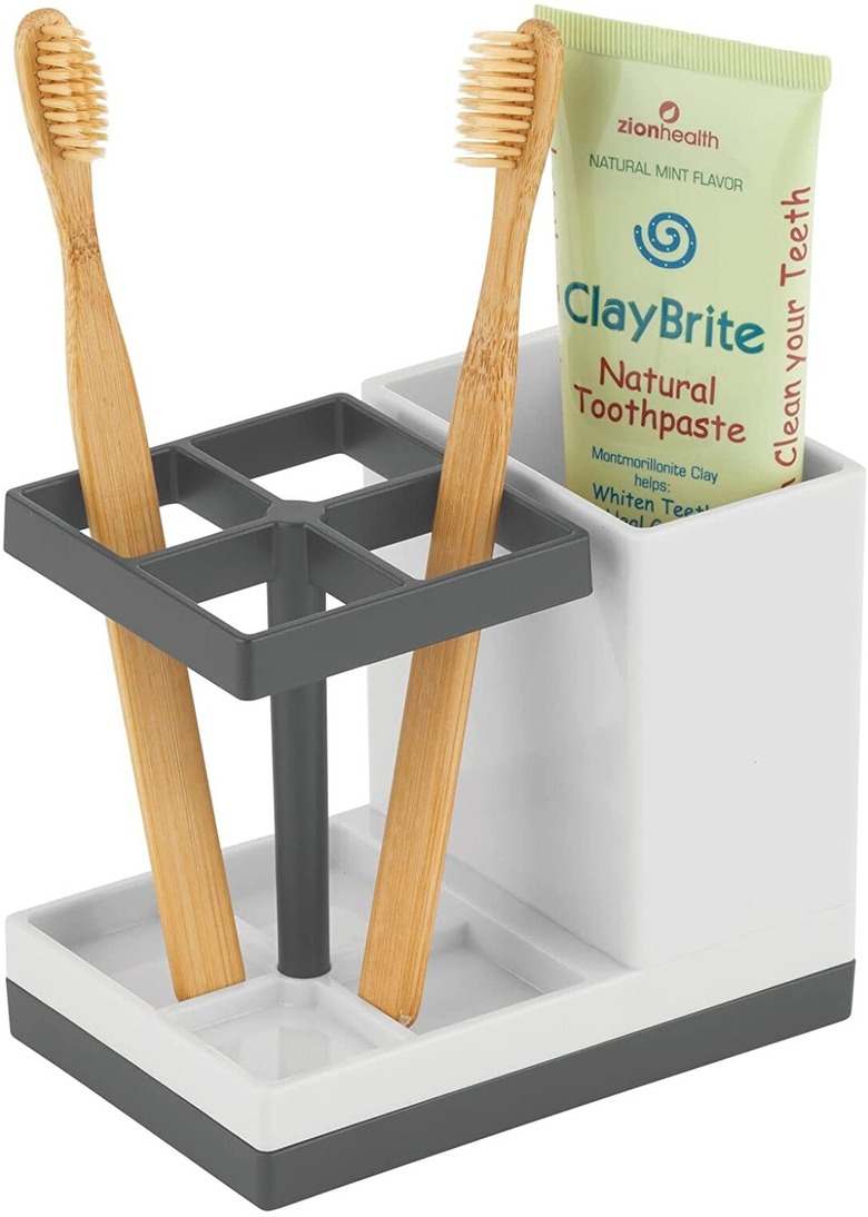 If you're looking for a simple design to house your toothbrush and toothpaste, look no further than this pick from mDesign. It has five storage compartments and comes in different colorways that will blend in seamlessly with any bathroom countertop.