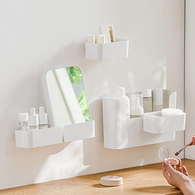 Have a small bathroom with limited counter space? Try these wall-mounted bathroom organizers. They come with easy-to-install adhesive plates and can hold up to 5 pounds per shelf.