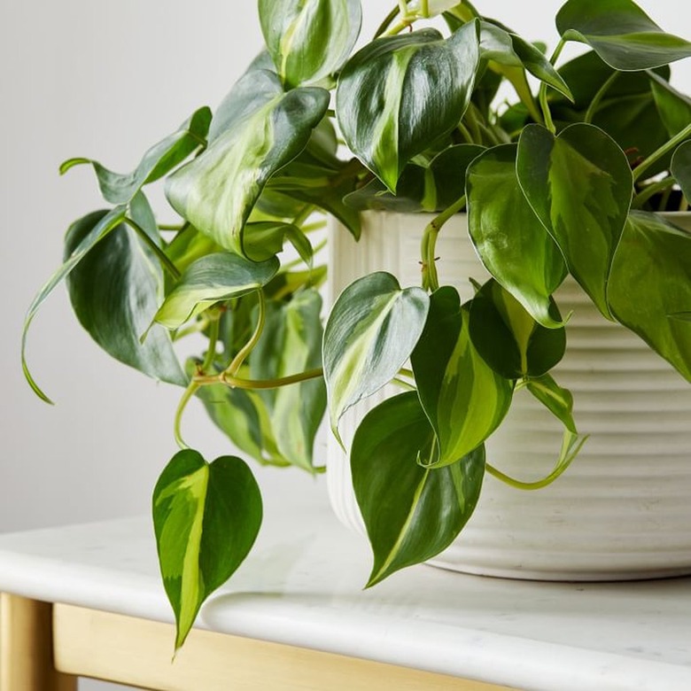 Pothos is an ideal first houseplant since it is so very easy to grow. Tolerant and forgiving, pothos grows happily in hanging baskets in low light areas like a north-facing windowsill. Golden pothos is a very appealing plant, a trailing vine with forest green leaves splashed and marbled in shades of yellow, cream, or white. It grows fast and requires little maintenance.