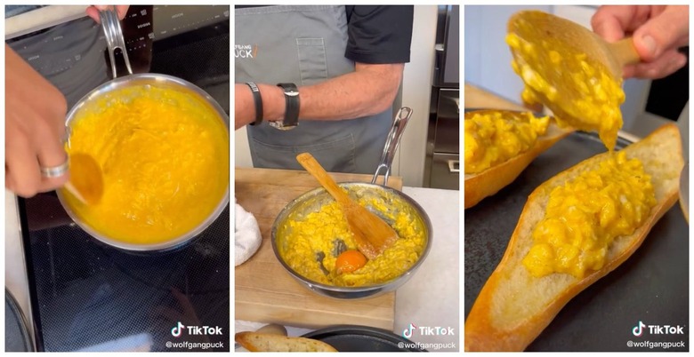 When it comes to scrambled eggs, chef Wolfgang Puck likes his as creamy as possible. That's why he adds a few teaspoons of cream along with an extra egg yolk once the scramble is out of the pan.To serve, Puck carves out a hole in a toasted baguette slice and places the eggs inside to hold the breakfast food.