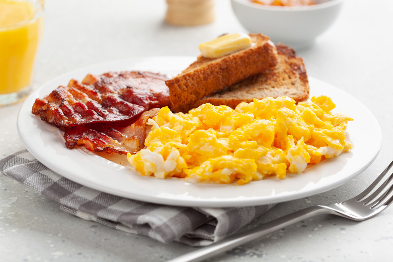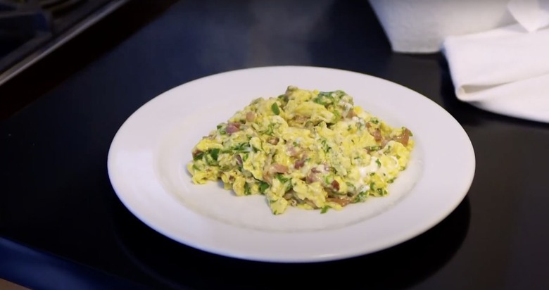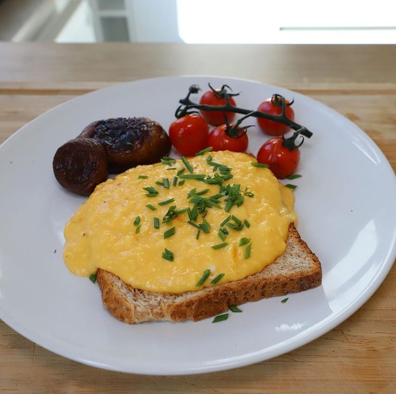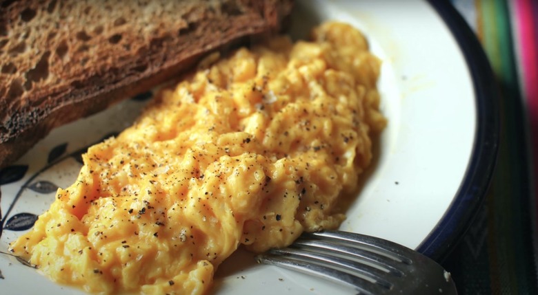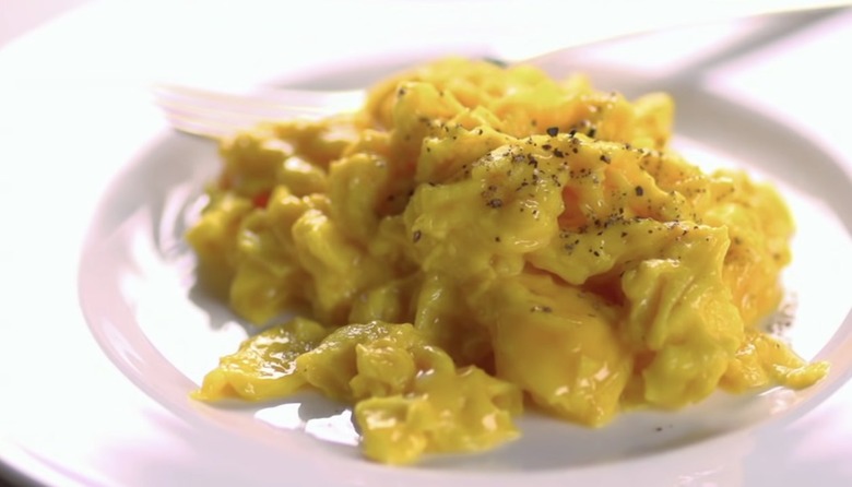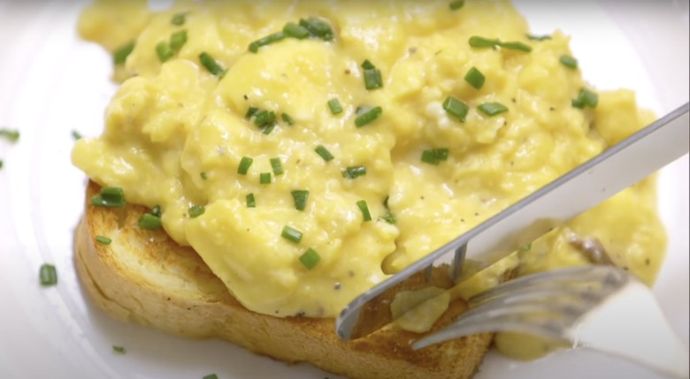 Food journalist and author Mark Bittman describes his scrambled egg recipe for the New York Times as "silky" and "outrageously good." To achieve this, all you need are three or four ingredients — sometimes Bittman includes cream — that are cooked on low heat for over 30 minutes (yes, really).