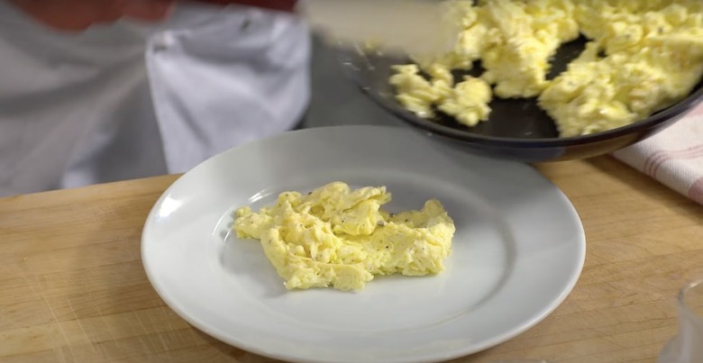 Emeril Lagasse embraces simplicity in his scrambled egg recipe. In a video on his YouTube channel, the chef whisks cream and eggs to incorporate air into the mixture. Then, he lets the eggs sit undisturbed on the pan until the outer edge is set and serves them on a warm plate. Compared to the other recipes, Lagasse's eggs are firmer.