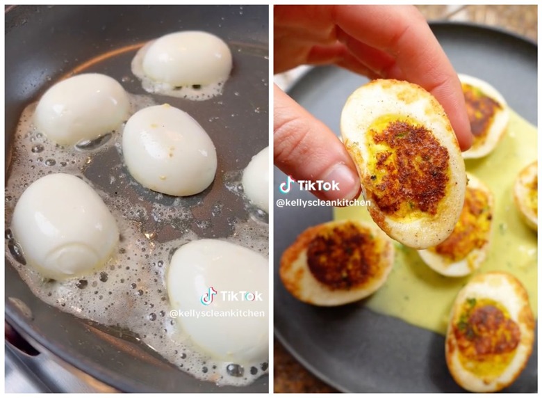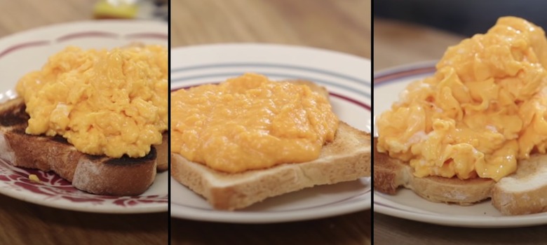 Oliver's general scrambled egg recipe features eggs mixed with salt and black pepper over low heat on a pan greased with butter. The eggs are stirred until they are silky, but slightly runny. Yet, Oliver also has a video showing scrambled eggs three ways — like the British, French, and Americans make them — that offer different textures.