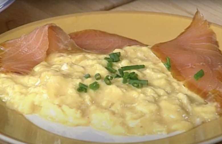 Ina Garten's scrambled eggs include half-and-half, and as for her stirring technique, the cook lets her eggs sit in the pan on low heat for three to five minutes before agitating them. Then, right before the eggs are done, Garten turns off the heat and adds cold truffle butter to stop the cooking process. She serves the eggs on a toasted slice of brioche and tops them off with chopped chives.